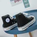 This classic black high-top canvas shoe features a simple and elegant design, making it a versatile choice for everyday wear. The upper is made of high-quality canvas material, offering breathability and durability for all-day comfort. The non-slip rubber sole enhances grip, ensuring walking safety. The timeless black-and-white color combination is stylish yet understated, suitable for various occasions, including campus life, casual outings, or daily commuting. The reinforced toe design improves durability, while the white laces add a touch of brightness to the overall look. This unisex shoe is an ideal choice for those seeking both comfort and style.