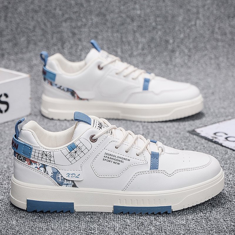 These trendy casual sneakers feature a classic white base accented with refreshing blue panels and geometric line details, delivering a modern and stylish design. Crafted with premium synthetic leather, the upper is soft, breathable, and easy to maintain. Paired with a durable, anti-slip rubber outsole, these shoes ensure confident strides and all-day comfort for any occasion.