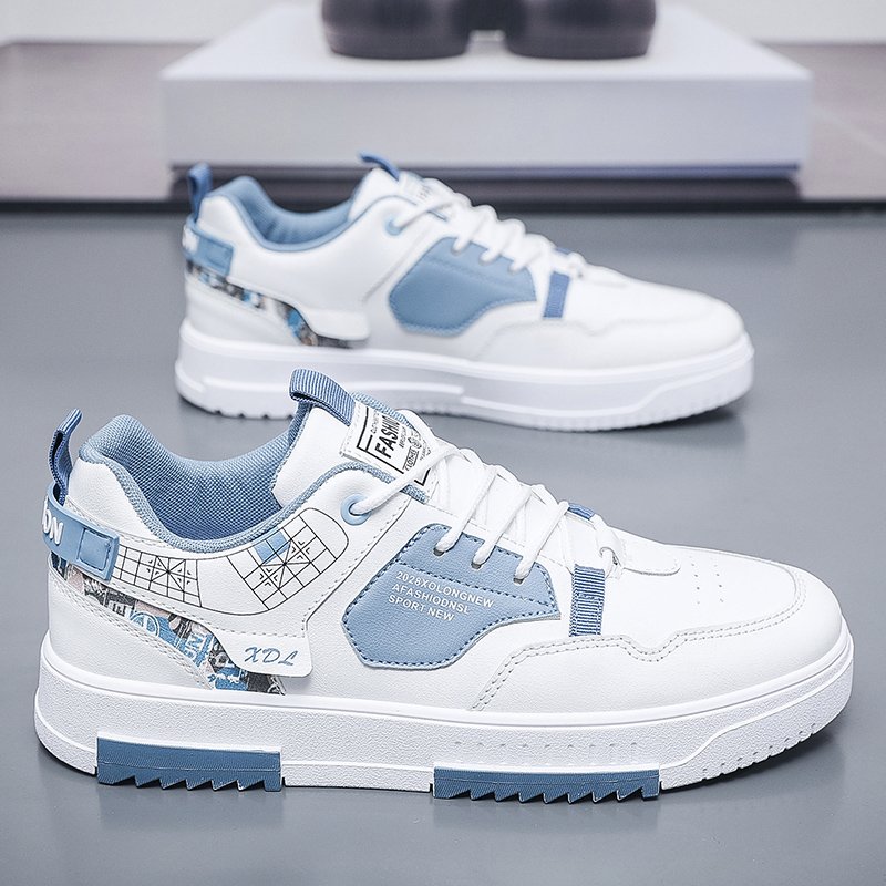 These stylish casual sports shoes combine modern trends with superior comfort. Featuring a clean white base accented by refreshing blue panels and unique graphic patterns, they showcase both individuality and contemporary style. Made with premium leather materials and a durable, anti-slip rubber sole, these sneakers ensure all-day comfort and stability, perfect for daily outings, sports, or casual occasions.
