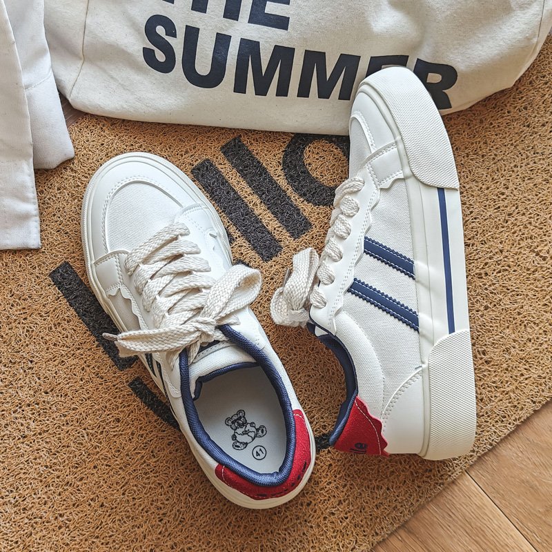 - Classic Color Combination: White base with blue stripes and a red heel for a simple yet fashionable design.