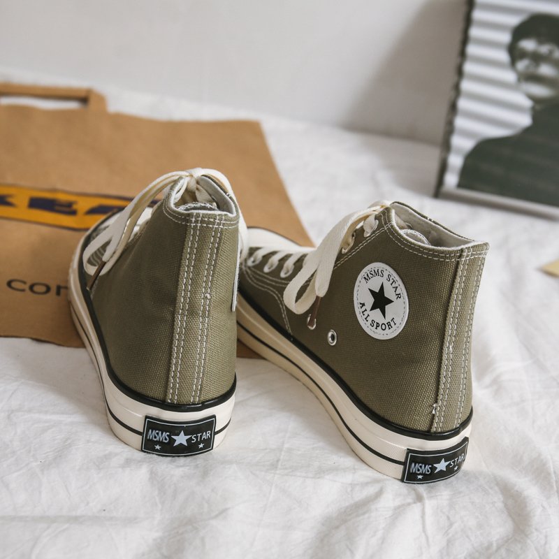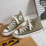 Combining retro aesthetics with modern comfort, these army green high-top canvas shoes are durable, stylish, and versatile. Elevate your daily style with this essential pair of sneakers.