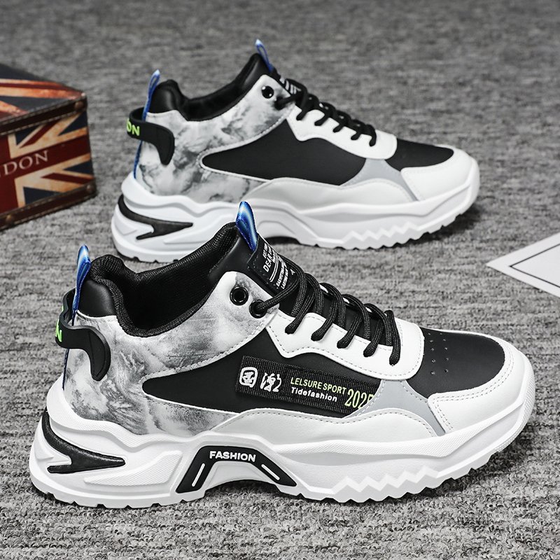trendy sports sneaker blends street style with modern design, featuring high-quality leather and breathable mesh panels for durability and comfort. The unique black, white, and gray color-block design, complemented by bold trend-inspired logos and detailed accents, makes it stand out from the crowd. The thick, non-slip outsole provides excellent support and stability, perfect for both everyday wear and athletic activities. Whether you’re a fashion enthusiast or someone who prioritizes comfort, this sneaker is a must-have to help you effortlessly embrace urban style. Get yours now and step into a new chapter of fashion!