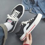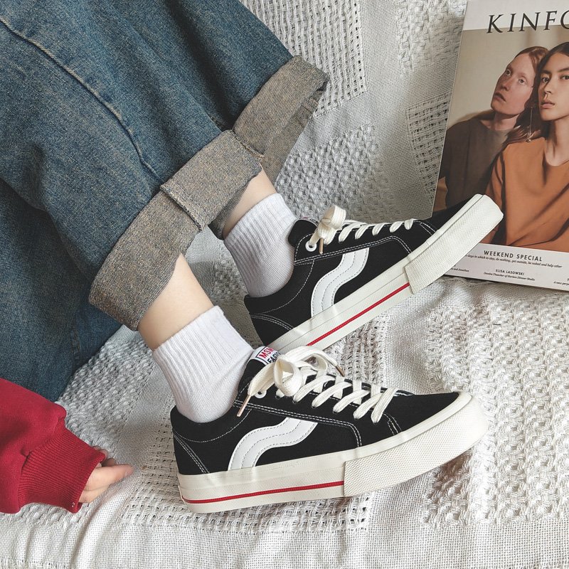 These black and white sporty casual shoes combine classic design with modern elements, delivering a versatile and stylish look for any occasion. The upper is crafted from premium canvas material, ensuring lightweight breathability and lasting comfort. The signature white wave stripe adds a dynamic and unique touch, while the reinforced white rubber toe cap and outsole enhance durability and slip resistance. A subtle red accent along the midsole adds a pop of color, giving the design a fresh and vibrant feel. The cushioned insole and soft inner lining provide superior comfort, keeping your feet relaxed throughout the day. Perfect for daily commutes, streetwear, or casual outings, these sneakers are a must-have addition to your wardrobe.