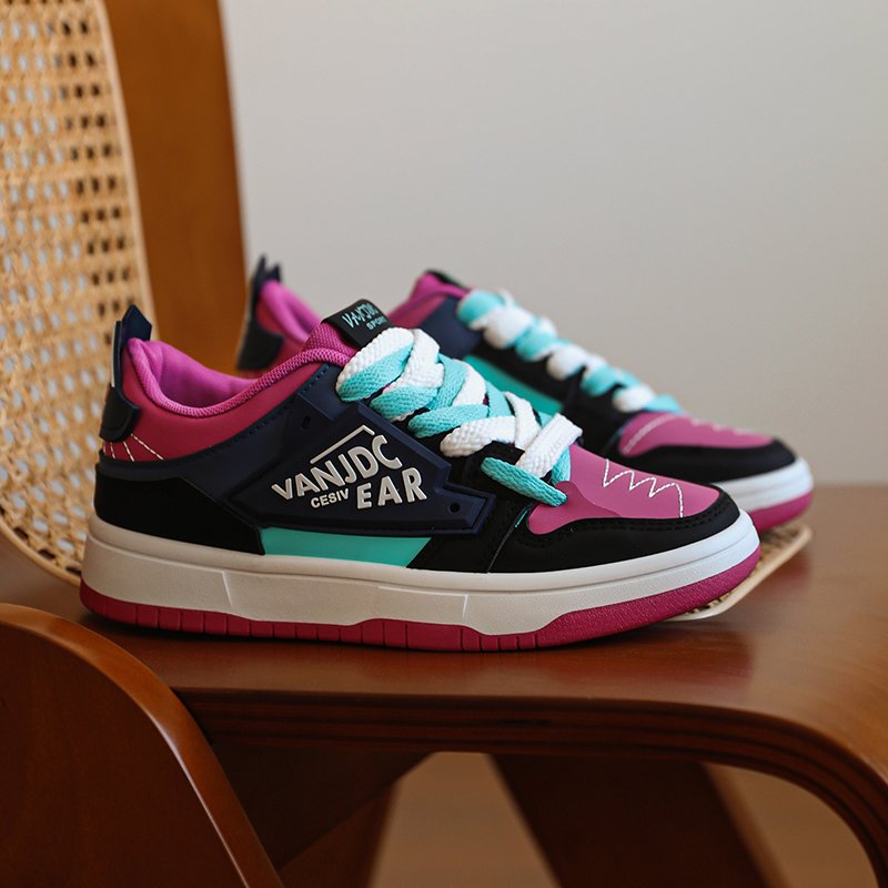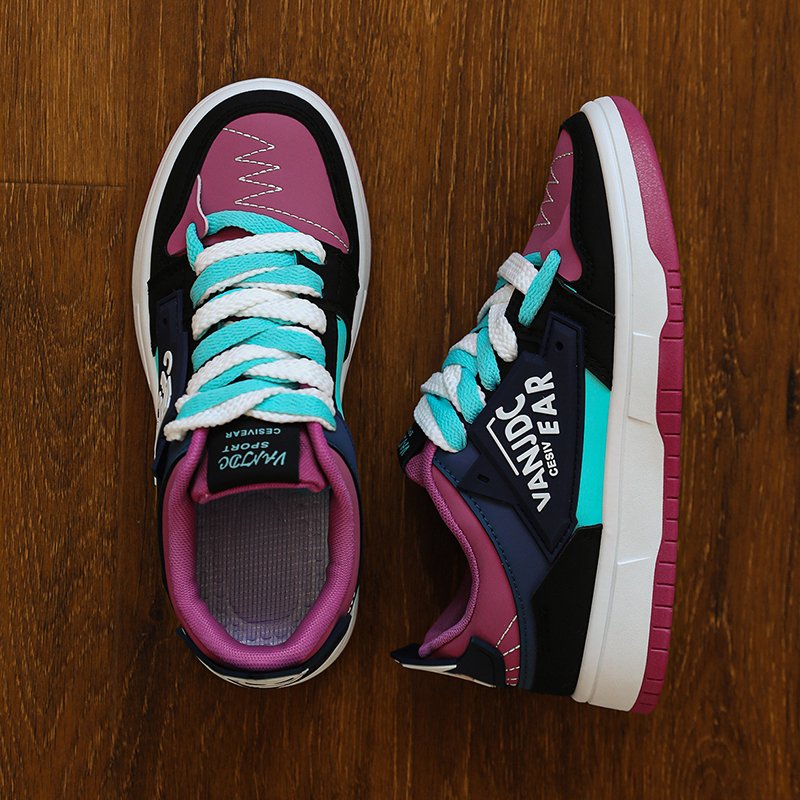 This trendy and stylish sneaker features a unique color-blocking design, with violet and black as the main tones accented by striking blue details, creating a distinctive and eye-catching look. The upper is made of high-quality synthetic materials, offering both breathability and durability to ensure all-day comfort. The thickened sole provides excellent cushioning and enhanced support, making it perfect for everyday wear or light exercise. The side of the shoe features personalized logo designs and textured details, adding a touch of street fashion. Whether paired with casual or athletic wear, these sneakers will make you stand out in the crowd!