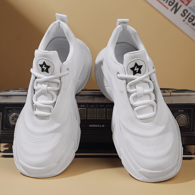These all-white chunky sneakers stand out with their sleek and minimalistic design, perfectly blending modern trends with ultimate comfort. The upper is crafted from high-quality breathable materials, featuring smooth, streamlined lines that ensure all-day wearability without discomfort. The thick rubber sole provides excellent grip and stability while subtly elongating the legs for a stylish height-boosting effect. Whether for casual streetwear or everyday outings, these versatile sneakers are a must-have, combining lightweight comfort with effortless style to showcase your confidence anywhere, anytime!
